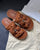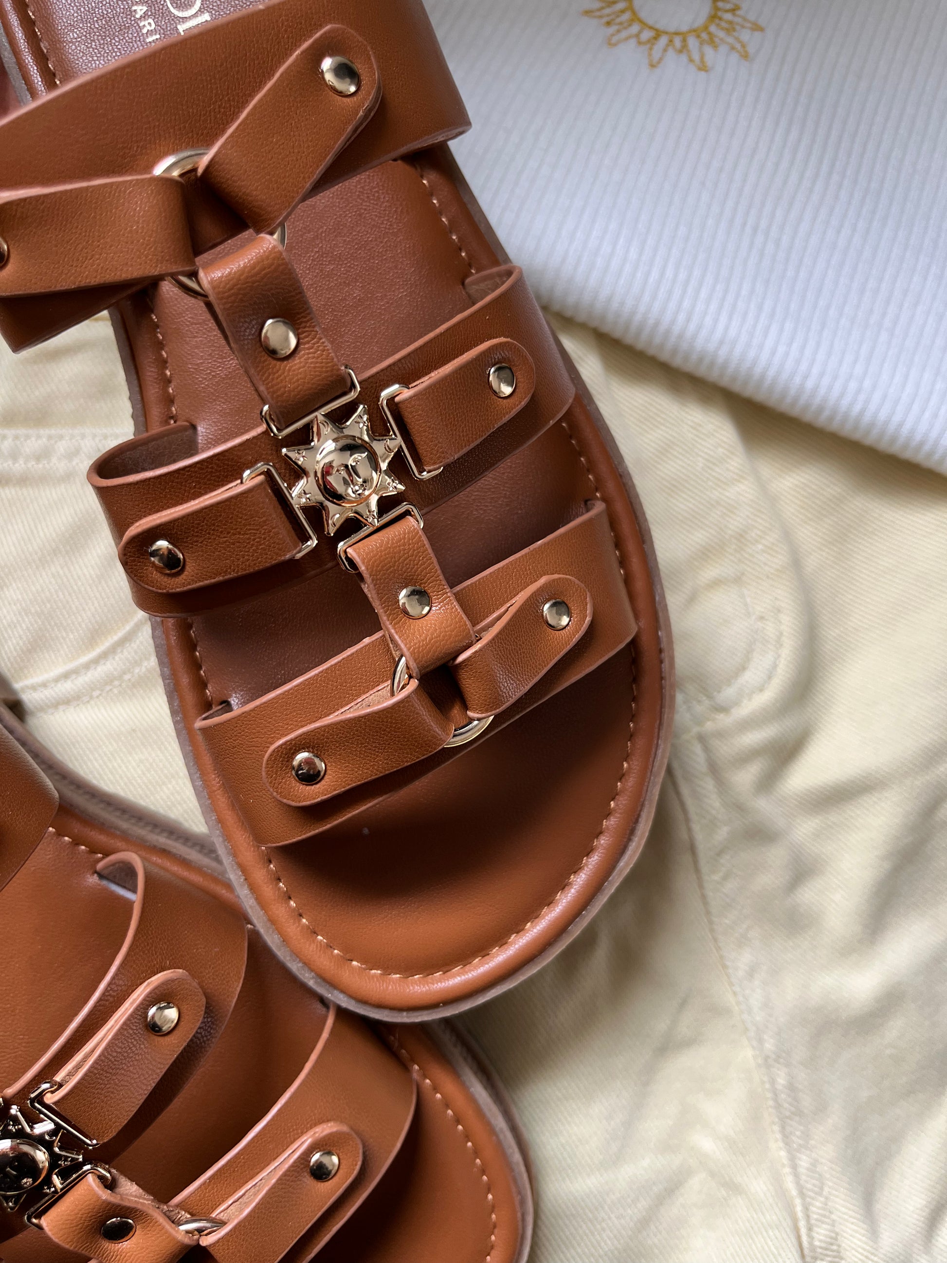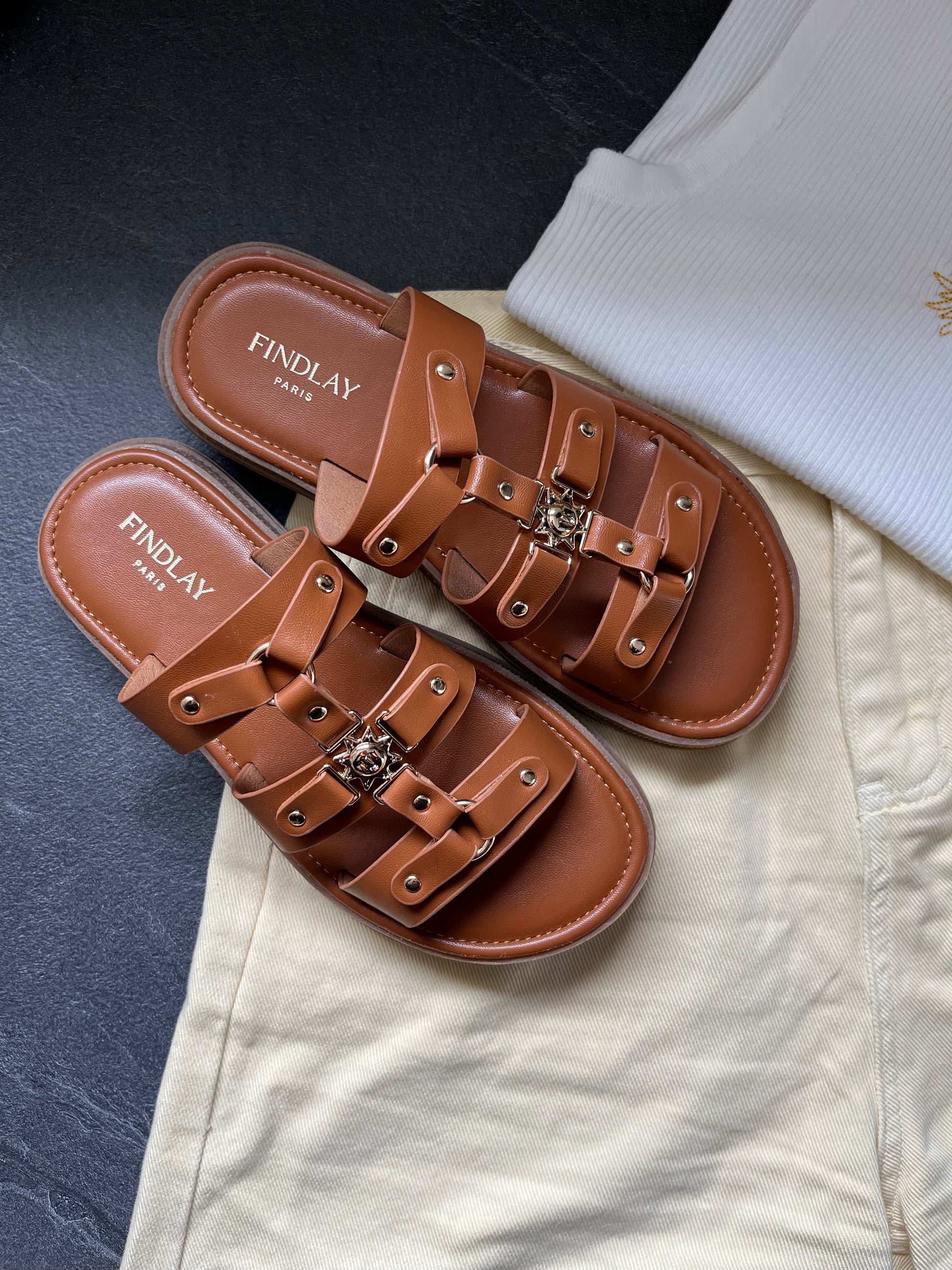- Soleil et détails dorés sur les lanières (clou et boucle)