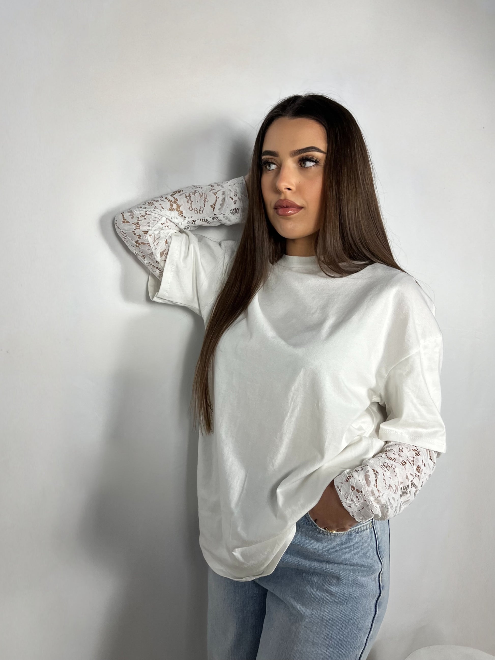 - Tee-shirt blanc à manches courtes avec détails en dentelle effet manches longues