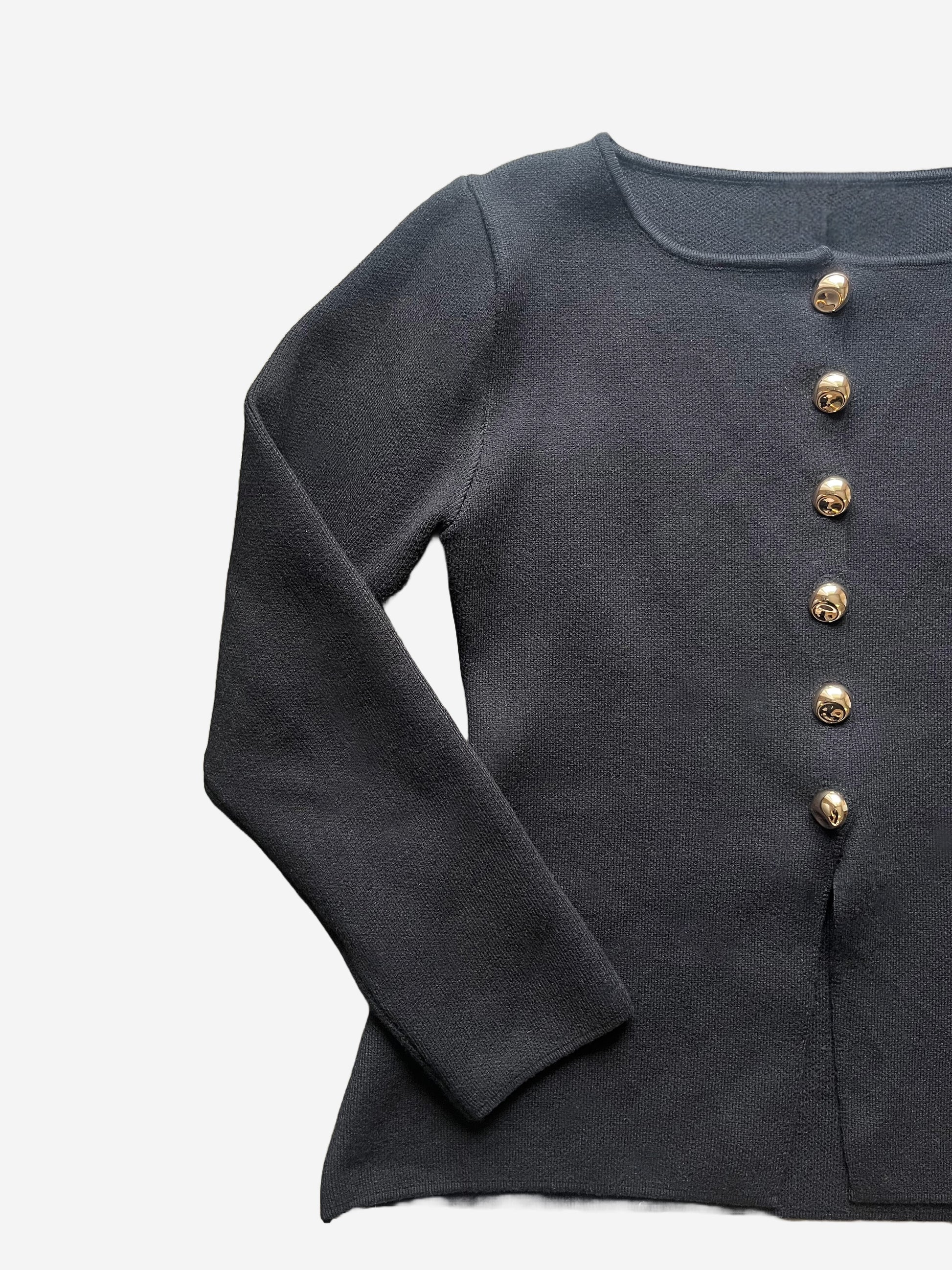 Ce top élégant allie style classique et détails raffinés pour une tenue sophistiquée. Avec ses manches longues et ses boutons dorés, il est parfait pour les occasions où vous souhaitez rester chic tout en restant confortable.